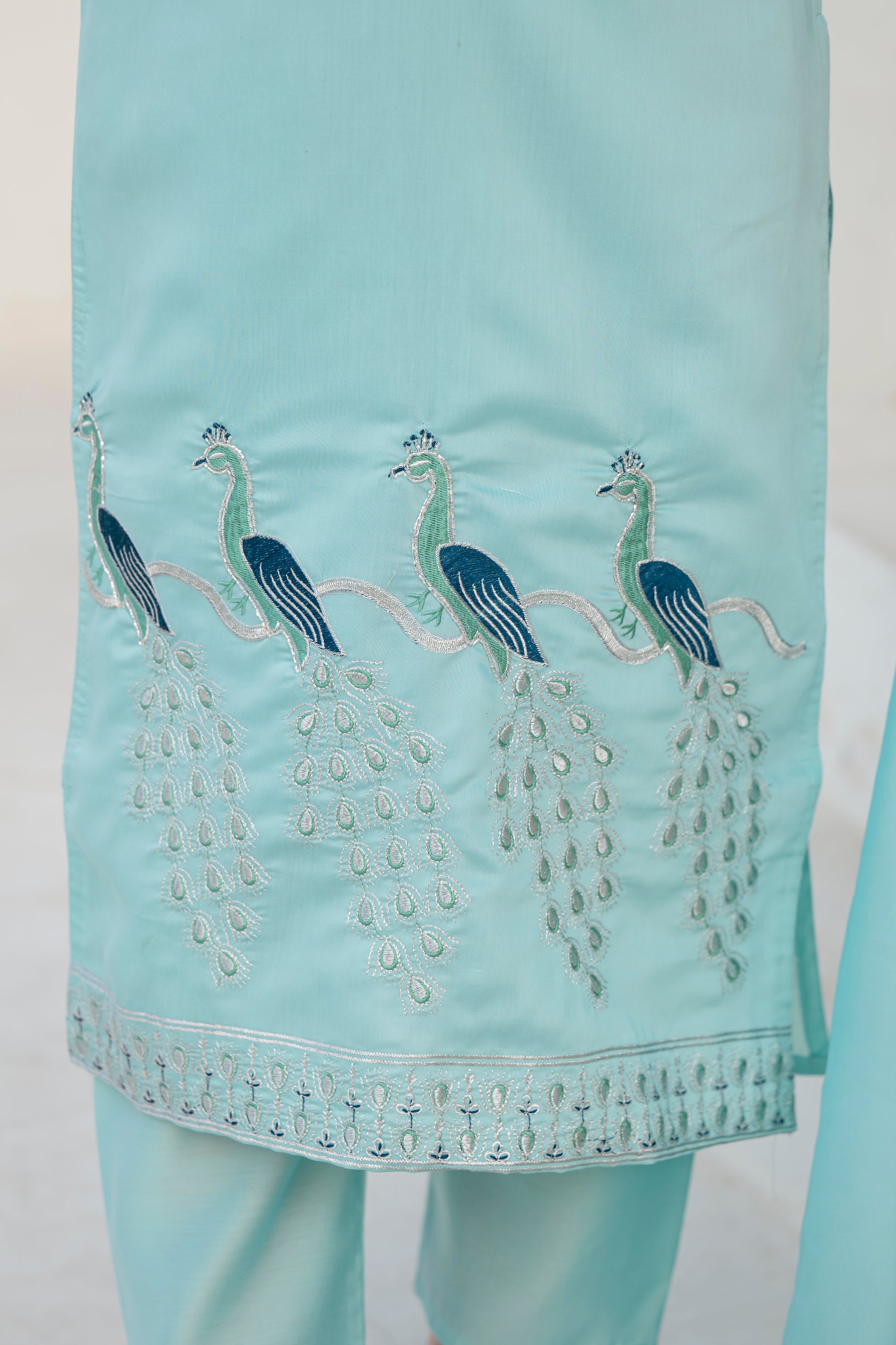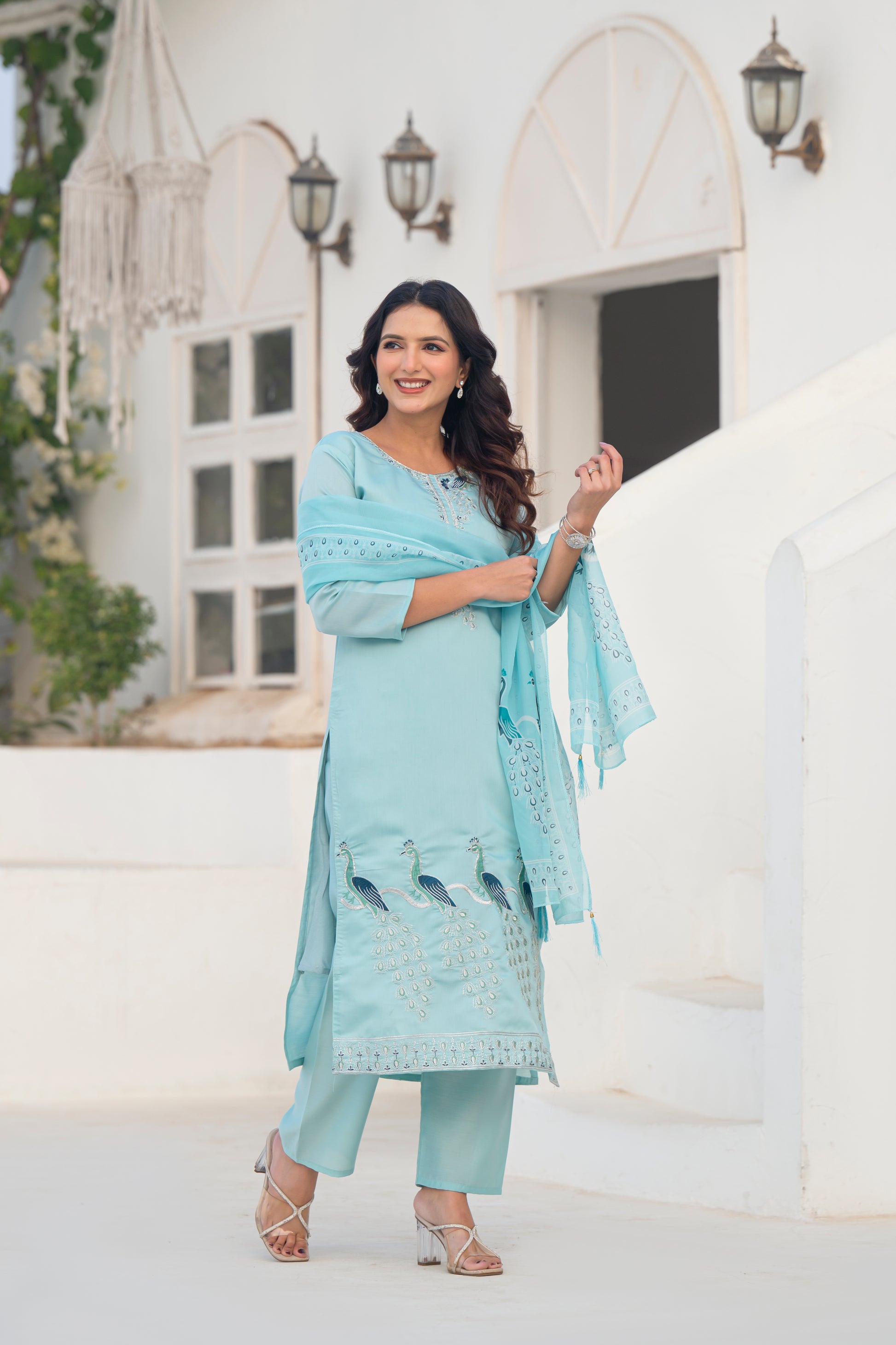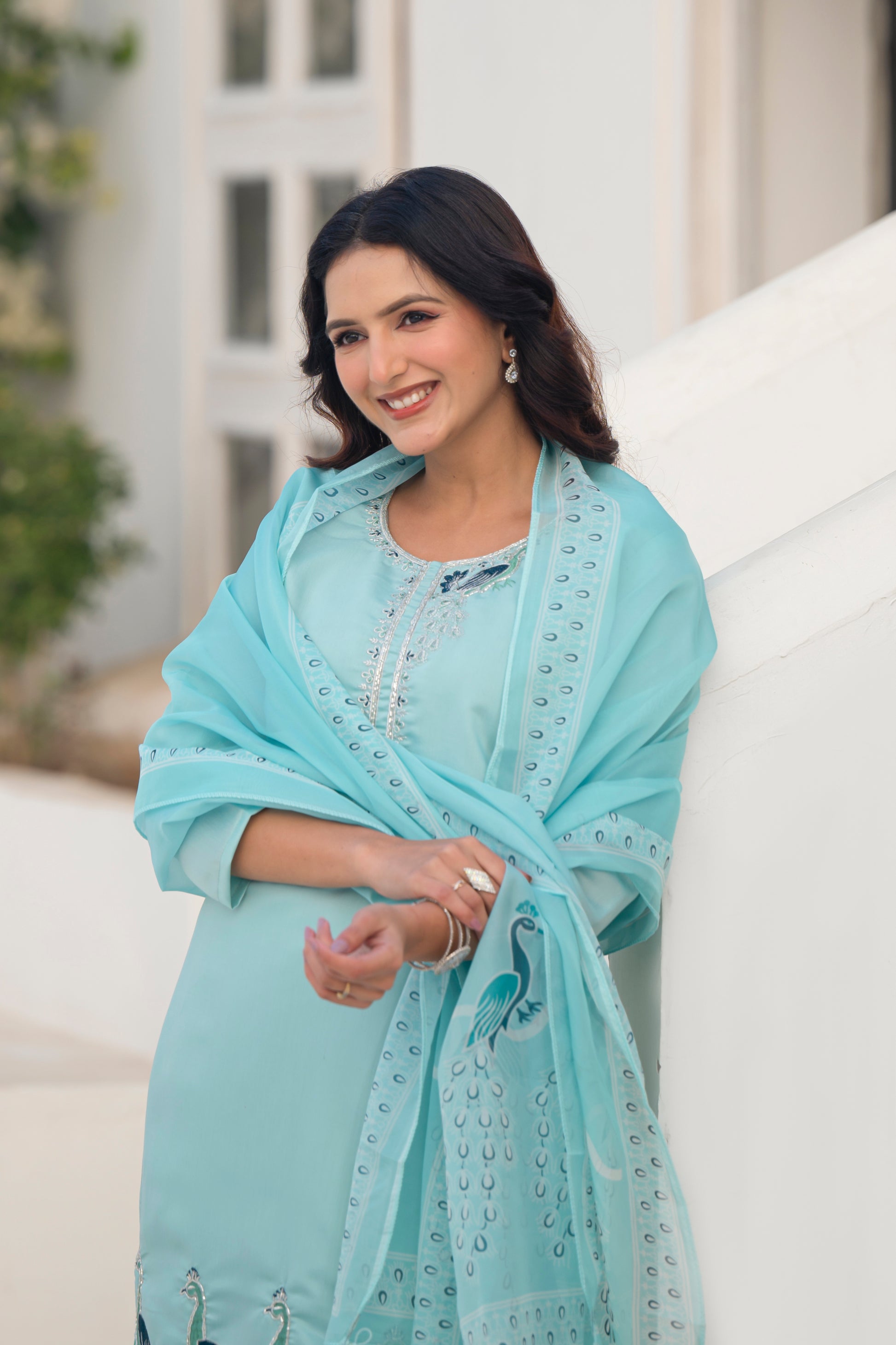 Coral Blue Embroidered Roman Silk Suit Set with Dupatta