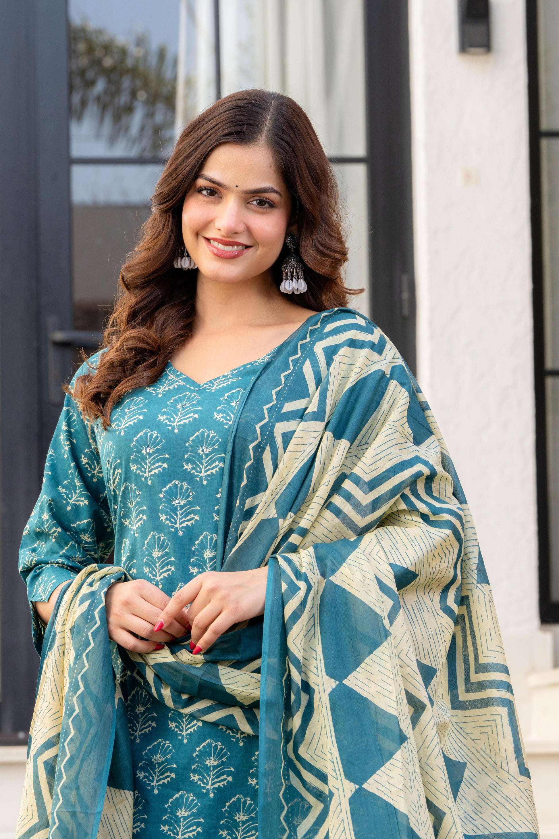 Deep Aqua Printed Cotton Kurta and Pant Set with Dupatta Elevate your ethnic wardrobe with this stunning deep aqua printed cotton ensemble. The three-piece set features a beautifully printed kurta paired with comfortable matching pants and a coordinating dupatta, making it an ideal choice for festive celebrations, family gatherings, and formal occasions. Crafted from breathable cotton, this set ensures all-day comfort while maintaining its elegant appearance. The rich aqua hue complements a variety of skin tones, while the intricate print adds visual interest and traditional charm. Perfect for those seeking versatile, ready-to-wear Indian wear that transitions seamlessly from day events to evening celebrations.