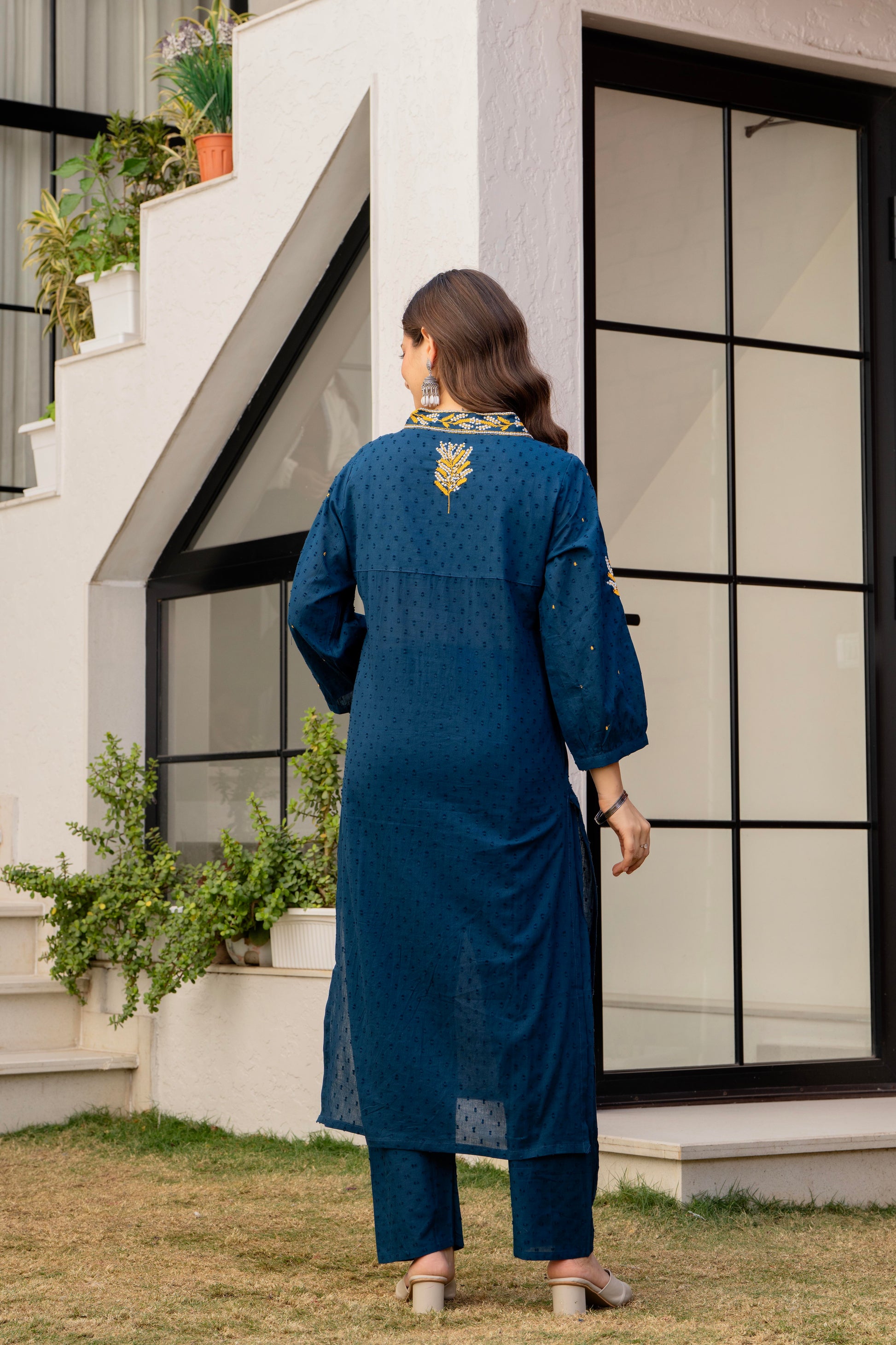 Light Navy Embroidered Cotton Kurta and Pant Set