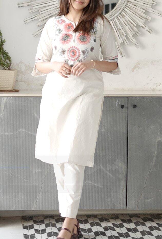 Off White Embroidered Cotton Flex Kurta and Pant Set