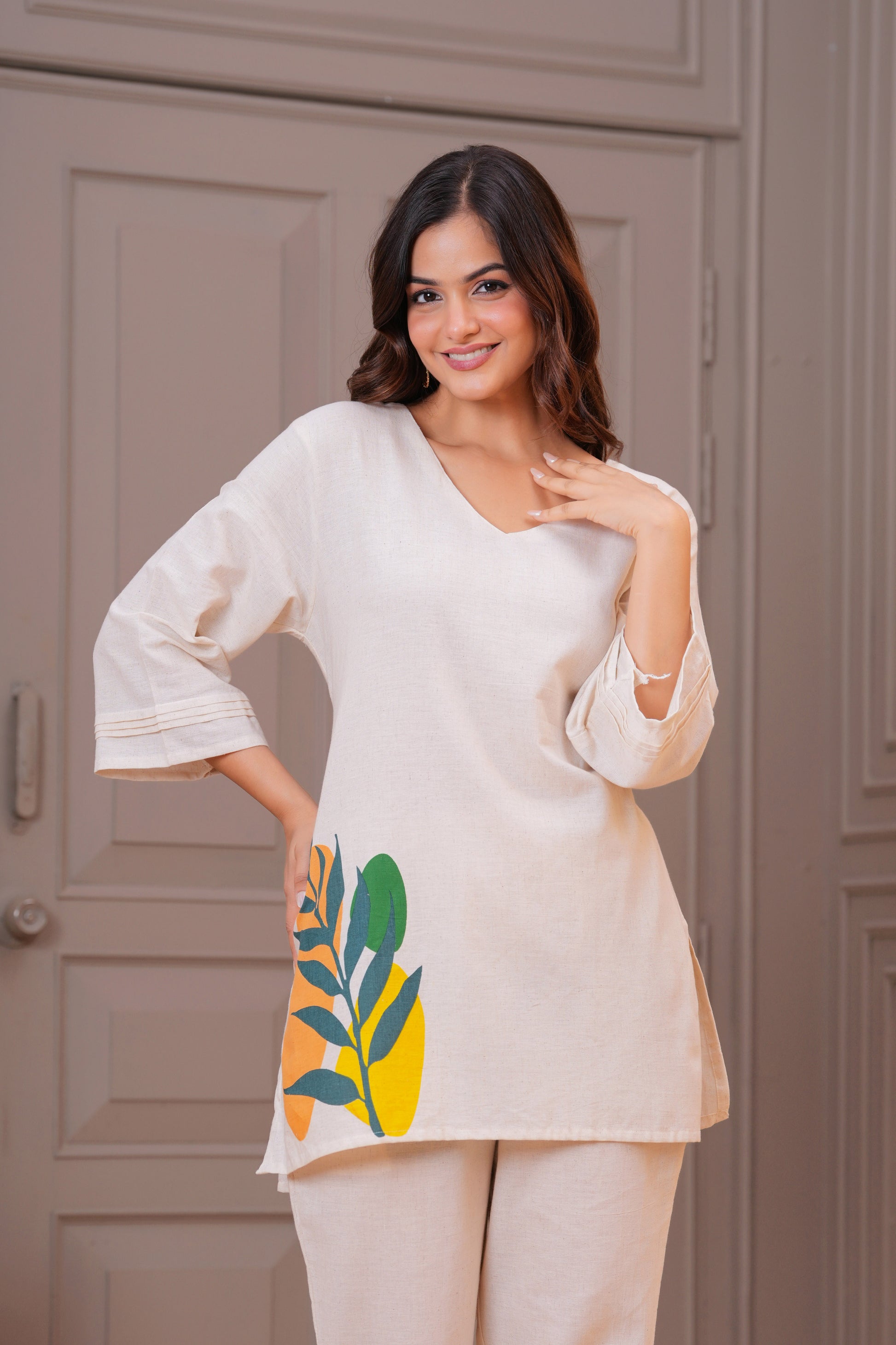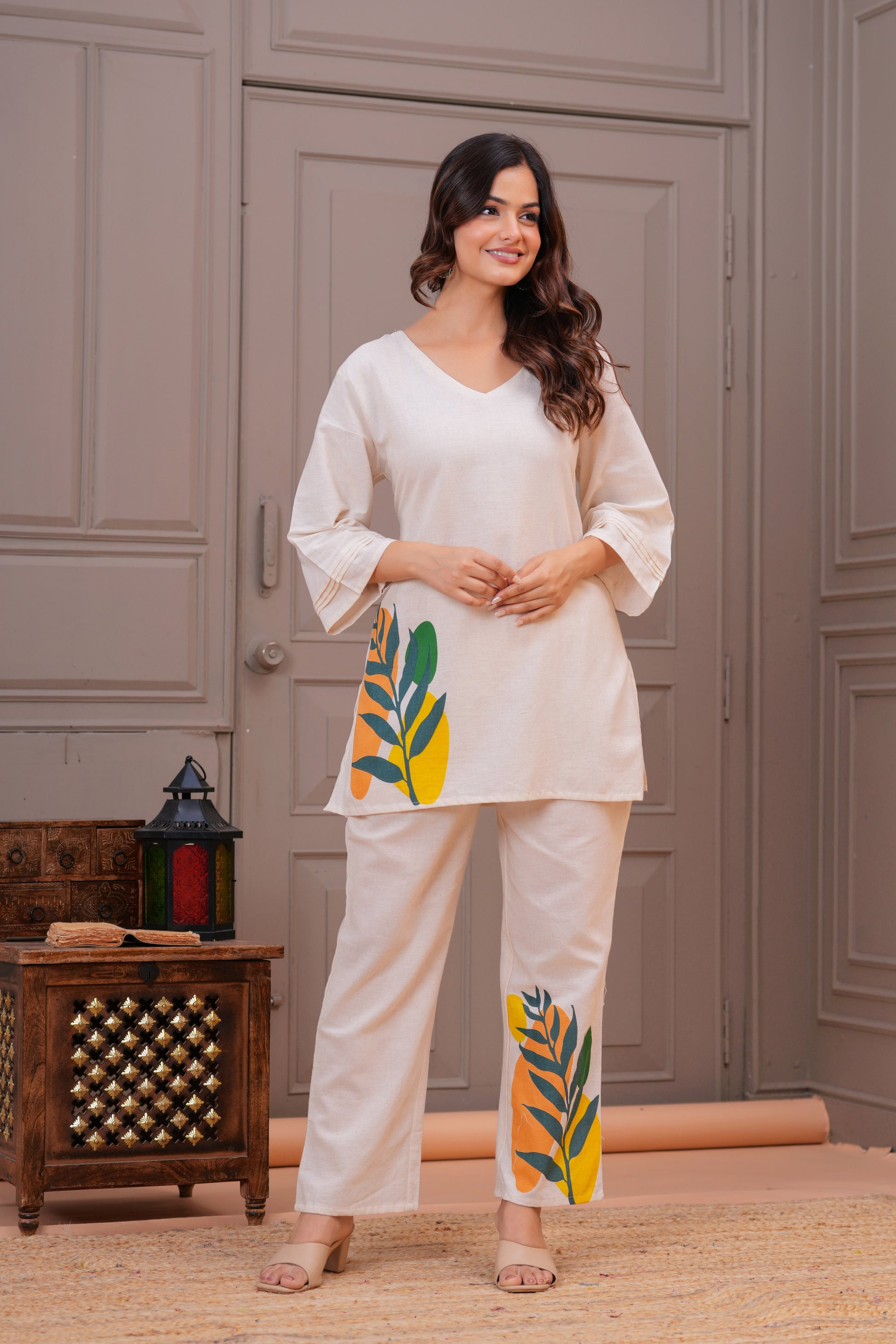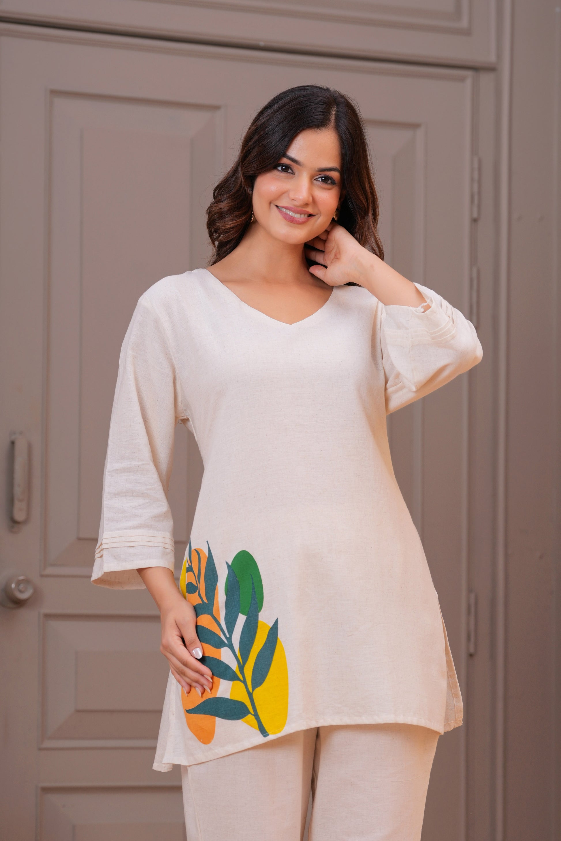 Elevate your style with our Off White Printed Cotton Flex Co-Ord Set. Made from high-quality cotton flex fabric, this set is designed to provide comfort and breathability. The subtle print adds a touch of sophistication to your look, making it perfect for any occasion. Upgrade your wardrobe now!