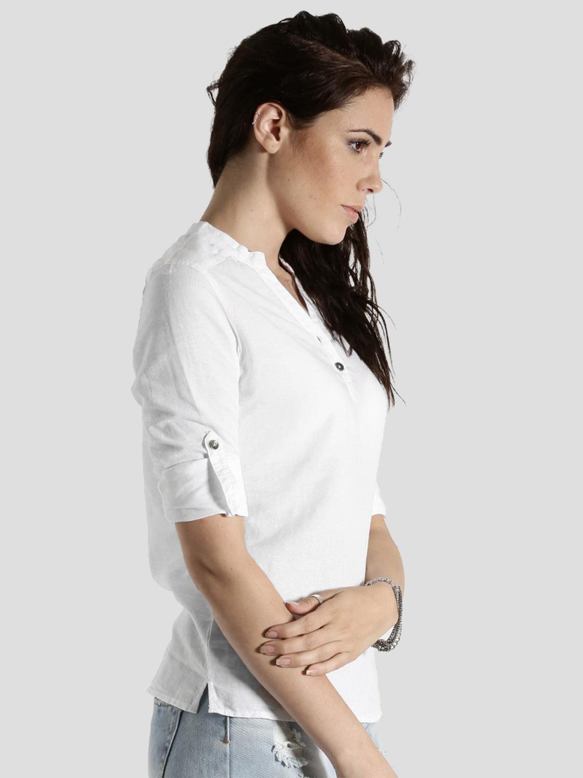 White Cotton Linen Roll Up Sleeves Short Kurta